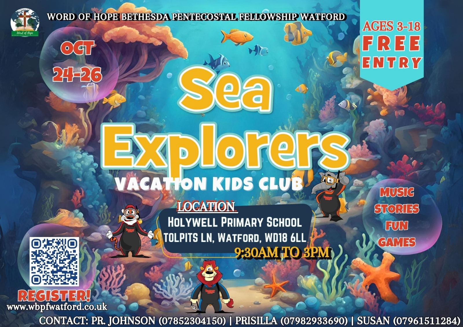 WBPF Watford’s vacation kids club is taking place on October 24, 25 and 26 and this year, our theme is Sea Explorers! We will deep dive into the underwater world and learn more about God’s creation and His amazing plan for us. Each day, there will be music, activities, games and great fun. All kids between ages 3-18 are welcome to join us and make sure to invite as many friends as you can! Food and snacks will be provided each day as well. See you there!